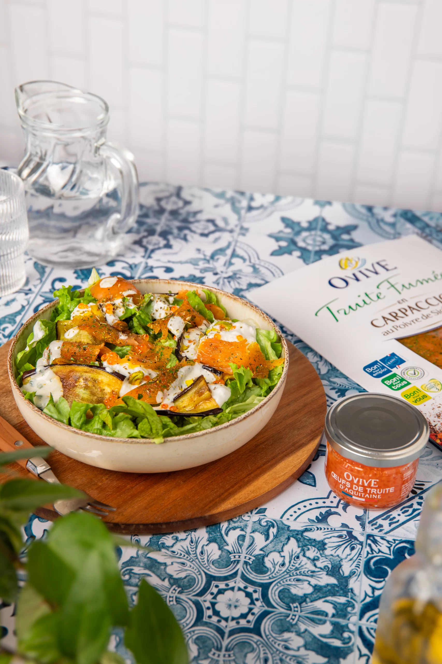 - Passez à l’assemblage de la salade composée. Pour chaque assiette, déposez la salade verte sur le fond, puis ajoutez les aubergines cuites, les morceaux de truite fumée Ovive puis des cuillerées du coeur des burrata.